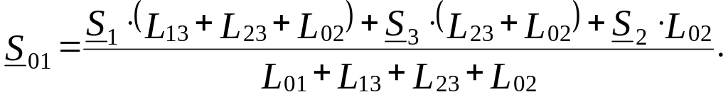 Уравнения для расчета потока мощности на “головных” участках сети составляются по известному “правилу моментов”. Однако уравнения включают в себя сопротивления линий сети, значения которых пока неизвестны. Чтобы решить поставленную задачу, на данном этапе расчета принимается условие, что сеть однородна, т.е. для всех линий соблюдается соотношение Ro/Xo = const. Тогда уравнение для расчета комплексных значений потоков мощности на головном участке, например, ЛЭП-01 примет вид: