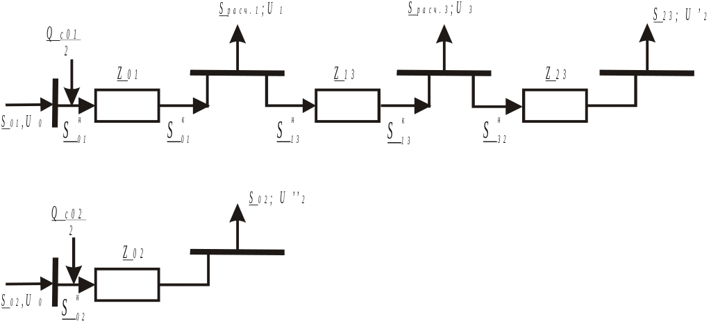 Методика расчета разомкнутой сети показана в контрольном задании 1, в соответствии с которой здесь потоки мощности в каждой из разомкнутой схем рассчитываются с учетом потерь мощности, начиная от точки потокораздела. При этом нагрузкой узла 2 сети 01-13-32 является мощность S-23, а для линии 02 – S-02, полученные на 1-ом этапе расчета сети (см. раздел 2.1). Тогда расчет мощностей в сети 01-13-32 начинается с расчета мощности в начале линии 3-2: