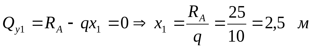 Бұл теңдеу бірінші бөлікте ию моментінің эпюрасы қисық сызықпен (парабола) шектелетінін көрсетеді. Қисық сызықты кем дегенде үш нүкте арқылы жүргізуге болады. Үшінші нүкте ретінде жанама күш нөлге тең болатын қиманы аламыз, себебі осы қимада ию моменті өзінің экстремальды мәніне жетеді.