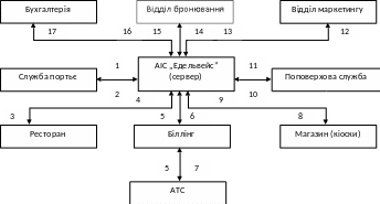 На рис. 1. зображено основні блоки готельної структури в умовах використання АІС «Едельвейс». Стрілками показано інформаційні потоки, за якими передають інформацію про: