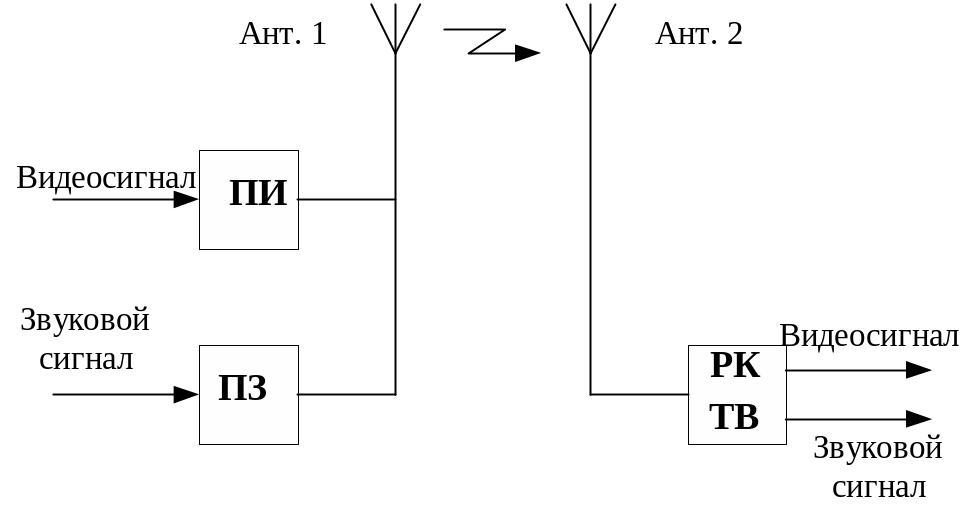 Рис. 7.1. Радиоканал ТВ вещания: ПИ – передатчик изображения; ПЗ – передатчик звукового сопровождения; Ант.1,2 – передающая и приемная антенны; РК ТВ – радиоканал телевизионного приемника