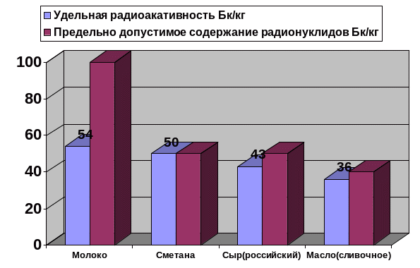 На втором этапе было проведено исследование молочной продукции. Вся молочная продукция произведена на территории Московской области. Полученные результаты представлены в таблице 2, а также на диаграммах 2.1 и 2.2. Наиболее высокое содержание радионуклидов в молочной продукции было выявлено в пастеризованном молоке, тем не менее превышения по предельно допустимому значению содержания радионуклидов в молоке не наблюдалось. Данное исследование подтвердило тот факт, что при переработке молока в сметану, сыр и масло содержание радионуклидов уменьшается.