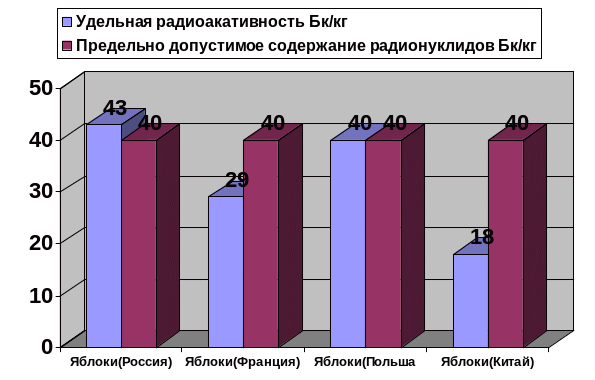 На четвертом этапе исследование содержания радионуклидов в фруктах проводилось на примере яблок, выращенных в разных странах. Такой выбор объясняется зимним временем года и невозможностью исследования ягод, выращенных на садово-дачных участках в Московской области, что на взгляд авторов было бы наиболее целесообразно. Поэтому для исследования были выбраны четыре сорта яблок, выращенных в Московской области и для контроля в других странах. Полученные результаты представлены в таблице 4 и на диаграммах 4.1 и 4.2. Наиболее высокий процент содержания радионуклидов наблюдался в образцах, выращенных в Московской области, наиболее низкий – в Китае. Все образцы имеют содержание радионуклидов ниже предельно допустимых значений.