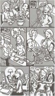 No, alone. I don't like shopping with other people. I have Lunch at La Cucina, my favourite Italian restaurant. Pasta, of course. And then, in the afternoon, I go to the beach with my friends. |