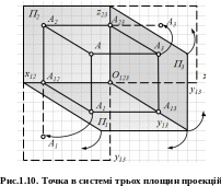 Проекції однієї і тієї ж точки на комплексному кресленні розташовуються не довільно, а знаходяться в проекційному зв’язку (рис. 1.11), який полягає в наступному: