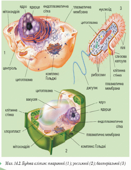 2. Розрізняти та демонструвати будову клітин еукаріотів та прокаріотів на манекенах, таблицях, планшетах.