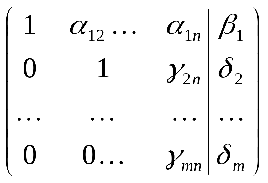 Условимся,что первым в системе (1) стоит уравнение, в котором коэффициент при первом неизвестном отличен от нуля (например а11≠0). Запишем систему (1) в виде матрицы опустив неизвестные и отделяя свободные члены вертикальной чертой