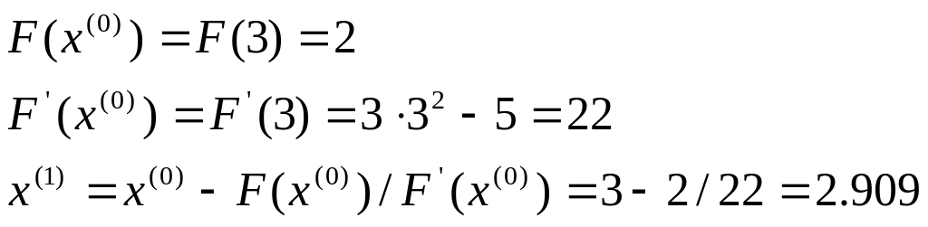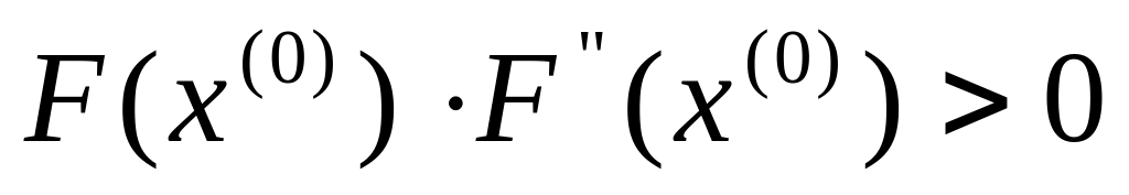Тоді на відрізку між a і b є не менше однієї точки, де функція F(x) перетинає вісь абсцис, тобто, F(x)=0. Як початкове наближення для визначення кореня рівняння F(x) можна взяти значення: