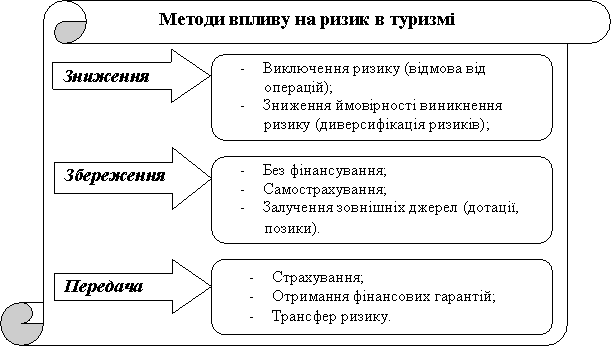 Тому необхідно скласти опис небезпечних ситуацій в галузі й на ринку збуту, а у бізнес-плані слід визначити розмір ризику, вірогідність його настання, міру керованості конкретним ризиком. Враховуючи сучасні тенденції міжнародної туристичної та готельно-ресторанной діяльності, а також зростання рівня ризиків, важливими завданнями є застосування ефективних методів управління ризиками.