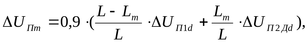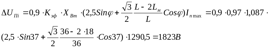 Потеря действующего напряжения первой гармоники на тяговой подстанции ( при равных сопротивлениях подстанций ) может быть определена по формуле