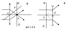 Лучи, параллельные главной оптической оси, после преломления в линзе собираются в одной точке, называемой главным фокусом линзы (F) рис.1.4.4 а. Точка пересечения оптической оси с фокальной плоскостью называется побочным фокусом (F).