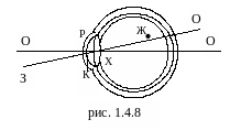 №23 Глаз может быть представлен как центрированная оптическая система, образованная роговицей ( Р ), жидкостью передней камеры ( К ) и хрусталиком ( Х ), ограниченная спереди воздушной средой, сзади - стекловидным телом (рис.1.4.8). Главная оптическая ось ( ОО ) проходит через оптические центры роговицы и хрусталика. Кроме того, различают еще зрительную ось глаза ( ЗО ), которая определяет направление наибольшей светочувствительности и проходит через центры хрусталика и желтого пятна (Ж). Угол между главной оптической и зрительной осями составляет около 5’.
