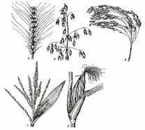 а – колос пшениці; б, в, г – волоті відповідно вівса, проса, кукурудзи;