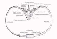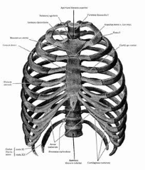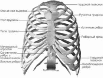 Ребра, 12 пар, - узкие, различной длины изогнутые костные пластинки, симметрично располагаются по бокам грудного отдела позвоночного столба. В каждом ребре различают более длинную костную часть ребра, короткую хрящевую - реберный хрящ, и два конца - передний, обращенный к грудине, и задний, обращенный к позвоночному столбу.