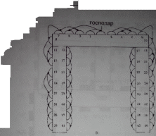 варіант: праворуч від стопки тарілок в полотняну серветку, складену конвертом, кладуть ножі перпендикулярно краю столу, лезами до тарілок, а правіше — закусочні виделки на ребро.