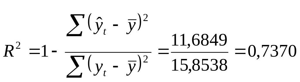 II способ - определение значения коэффициента детерминации по таблице Регрессионная статистика (рис. 4): R2 = 0,73818975 (ячейка В5). Коэффициент детерминации показывает долю вариации результативного признака под воздействием изучаемых факторов, т.е. 73,82 % вариации зависимой переменной учтено в модели и обусловлено влиянием включенных факторов.