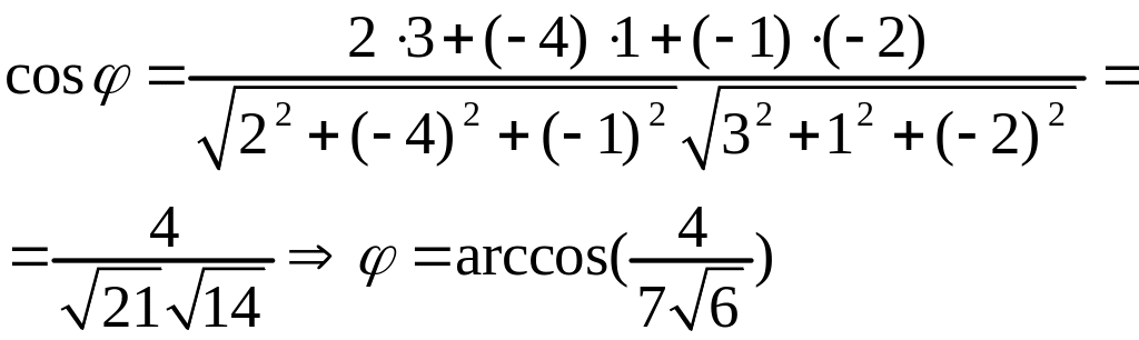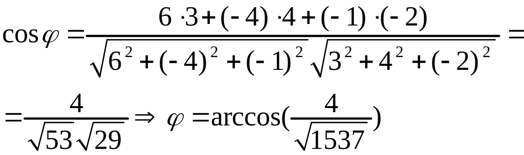 Угол между прямыми и равен углу между их направляющими векторами и , который находится из формулы
