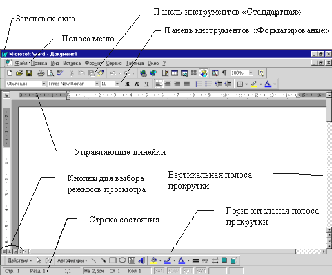 После запуска на экране появится окно редактора Word (рис. 1). В заголовке окна редактора Word кроме названия программы отражается и имя редактируемого файла. Под полосой меню находятся так называемые панели инструментов. Инструменты предназначены для более быстрого выполнения команд по сравнению с выбором из меню. При первом запуске после установки на винчестер в окне Word видимы только две панели инструментов: “Стандартная” и “Форматирование”.