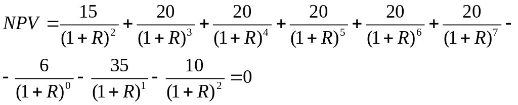 Оценкой эффективности вложений может служить внутренняя норма доходности R, т.е. такое значение коэффициента дисконтирования, при котором величина разности прибыли и затрат, обозначаемой NPV, равна нулю: