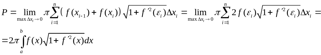 Определение. Площадью поверхности вращения кривой АВ вокруг данной оси называют предел, к которому стремятся площади поверхностей вращения ломаных, вписанных в кривую АВ, при стремлении к нулю наибольших из длин звеньев этих ломаных.