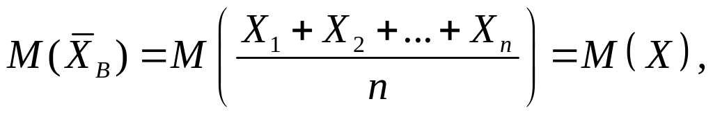 Выборочное среднее является не только несмещенной, но и состоятельной оценкой математического ожидания. Если предположить, что имеют ограниченные дисперсии, то из теоремы Чебышева следует, что их среднее арифметическое, т.е. , при увеличении п стремится по вероятности к математическому ожиданию каждой их величин, т.е. к . Следовательно, выборочное среднее есть состоятельная оценка математического ожидания.
