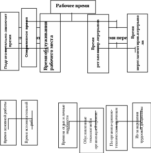 Рабочее время (продолжительность рабочей смены) с точки зрения его использования делится на две группы: время работы и время перерыва. Кроме этого рабочее время содержит следующие затраты: время на приготовительно-заключительные операции, оперативное время, время на обслуживание рабочего места, время регламентированных и нерегламентированных перерывов (рис.4.1).