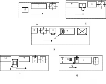 А - разруб, обвалка, зачистка мяса; Б – приготовление порционных и мелкокусковых полуфабрикатов; В – приготовление рубленных полуфабрикатов; Г – обработка птицы; Д – обработка рыбы и приготовление полуфабрикатов. 1 - опа-лочный горн; 2 - машина универсальная; 3 - мясорубка; 4 – котлетоформо-вочная машина; 5 - приспособление для очистки рыбы от чешуи; 6 - холодильный шкаф; 7,8 - столы производственные; 9 - стол со встроенной моечной ванной; 10 - стол производственный для очистки рыбы; 11 - ванна передвижная; 12 - ванна моечная; 13 - стеллаж передвижной (тележка - стеллаж); 14 - стеллаж производственный; 15 - стул для разруба мяса.