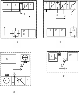 А - линия приготовления бульонов и супов; Б - линия приготовления вторых блюд, соусов, гарниров; В - линия приготовления горячих напитков; Г - линия произ-водства мучных изделий. 1 - плита электрическая; 2 - котел электрический; 3 - сковорода электрическая; 4- шкаф жарочный электрический; 5 - кипятильник электрический; 6 - секция-вставка с краном-смесителем; 7 - секция-вставка; 8 - малогабаритная тестомесильная машина; 9 – просеиватель настольный электрический; 10,12 - столы производственные; 11 - стеллаж передвижной.