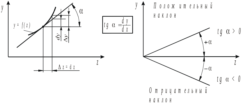 Из курса математического анализа известно, что геометрической интерпретацией производной функции y=f(z) является тангенс угла наклона касательной к графику этой функции (рис. 4.3,а).