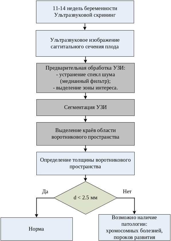 Схема узагальненого алгоритму напівавтоматизованого вимірювання товщини комірного простору у плоду представлена на рис. 6.4. Ультразвукове зображення сагітального перетину плоду отримують за допомогою ультразвукового сканера, після чого зображення проходить попередню обробку з метою фільтрації спекл шуму, виділення зони інтересу. Процес сегментації зони інтересу ультразвукового зображення проводиться з метою виділення безпосередньо зони комірного простору. Далі проводиться виділення країв зони комірного простору. Після цього обчислюється її товщина d. Отримане значення ТКП d разом з даними про вік матері і про концентрацію пов'язаного з вагітністю протеїну плазми крові і вільної β-субодиниці гормону, що виділяється плацентою під час вагітності, використовуються в процедурі розрахунку ризику генетичних відхилень.