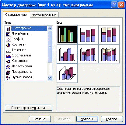 В Excel використовується 14 стандартних типів діаграм, кожен з них містить від трьох до семи видів. Найпоширенішими типами є:
