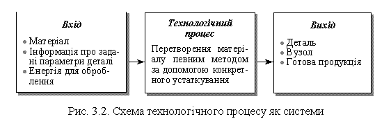 Будь-який технологічний процес можна розглядати як систему (рис.), яка має входи (склад сировини, її кількість, температура тощо) і виходи (деталі, вузли, готова продукція, їх кількість, якість та інші параметри).