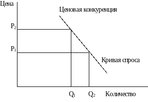 Компания, действующая при значениях Р1, Q1, может увеличить сбыт, снизив свою цену до Р2. Это увеличит спрос до Q2. Фирма, базирующаяся на ценовой конкуренции, должна снижать цены для увеличения сбыта |