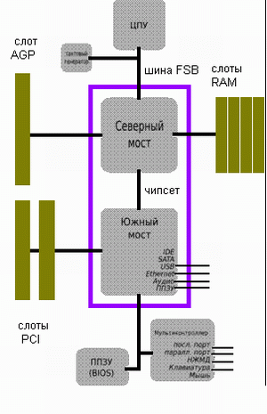 6) Назначение чипсета. Привести схему устройства материнской платы с указанием состава *северного* и *южного* мостов