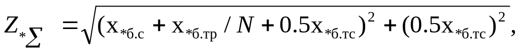 где х*б с — относительное индуктивное сопротивление энергосистемы до первичных вводов трансформаторов подстанции в рассчитываемом режиме максимума или минимума; х*б.тр — относительное индуктивное сопротивление понижающего трансформатора подстанции; N — количество трансформаторов (при расчете минимальных токов КЗ N = 1).