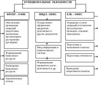 Эти подразделения осуществляют проведение всех банковских операций. Фронт – офис накапливает данные о проводимых операциях, мидл – офис осуществляет оформление и сопровождение банковских операций, затем информация передается в бэк – офис для обработки и анализа.