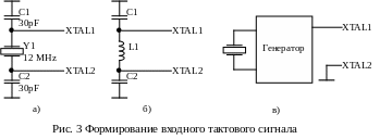 Частота внутреннего генератора может быть задана подключением к его выводам XTAL1 и XTAL2 кварцевого резонатора ( Рисунок 3 а), LC-цепочки ( Рисунок 3 б).