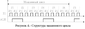 Устройство управления на основе сигналов синхронизации формирует машинный цикл фиксированной длительности, равный 12 периодам тактового генератора или 6 состояниям управляющего автомата S1-S6. Каждое состояние содержит две фазы Р1, Р2. В фазе Р1, как правило, выполняется операция АЛУ, а в фазе Р2 осуществляется межрегистровая передача.