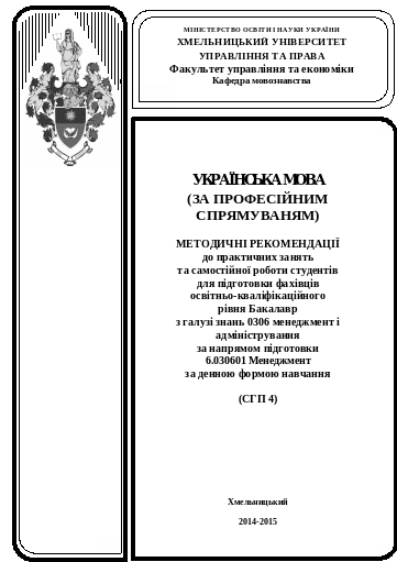 Українська мова (за професійним спрямуванням): Методичні рекомендації до практичних занять і самостійної роботи студентів для підготовки фахівців освітньо-кваліфікаційного рівня Бакалавр з галузі знань 0306 Менеджмент і адміністрування за напрямом підготовки 6.030601 Менеджмент / [розр. В.Г.Рогожа]. – Хмельницький: Хмельницький університет управління та права, 2015. – 133 с.