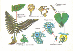 Вегетативное размножение: корневищами и почками, образовавшимися на листьях. Бесполое размножение – на нижней стороне листа образуются сорусы( группа спорангиев покрытых общей оболочкой). Половое размножение - из споры вырастает заросток (пластинка сердцевидной формы зелёного цвета с ризоидами). На нижней стороне заростка образуются ♂ и ♀ гаметы. Из оплодотворённой яйцеклетки образуется зигота, а из неё зародыш, дающий начало новому растению. |