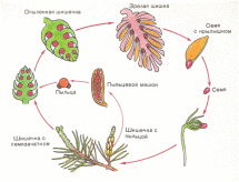 Весной образуются два вида шишек: ♂- зеленовато- желтого цвета у основания молодого побега, в них созревает пыльца и ♀- красноватого цвета на верхушке молодого побега, на чешуях которых созревают семязачатки (см. рисунок). Пыльца ветром переносится на чешуи ♀ шишек, которые закрываются и заклеиваются смолой. В пыльце образуются спермии, а семязачатках яйцеклетки. После оплодотворения из зиготы образуется зародыш семени, из гаплоидной центральной клетки семязачатка – эндосперм. Семена образуются всегда, даже если не произошло оплодотворение, так как эндосперм семени образуется из гаплоидной клетки. |