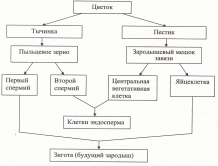 В зародышевом мешке происходит мейоз с образованием 4 гаплоидных клеток. Выживает только одна, которая трижды делится митозом. Из 8 клеток: 1- становится яйцеклеткой, две сливаются с образованием гаплоидной центральной клетки, остальные вспомогательные клетки.