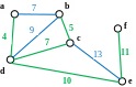 Рисунок 4 – Приклад графа з мінімальним каркасним деревом. Сумарна вага зображеного мінімального каркасного дерева рівна 37. Це мінімальне каркасне дерево не унікальне: видаленням ребра (c,d) та додаванням ребра (a,b) одержується нове мінімальне каркасне дерево