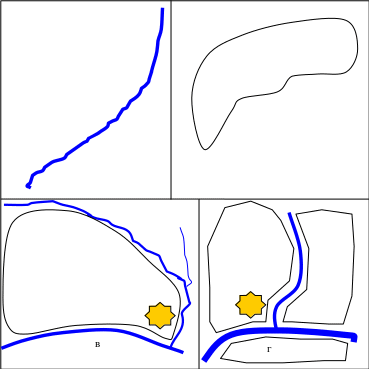 Общественные центры в населенном пункте формировались в рамках исторического развития поселения. Древнерусские города по типу плана можно подразделить на округлые, рассчитанные на круговую оборону; полукруглые, примыкающие тыльной стороной к воде (река, озеро, море); сегментные, занимающие перешеек между водными преградами; секторные, занимающие пространства между сливающимися реками, оврагами и другими естественными преградами (рисунок 1). Со временем разрастаясь, города приобретали округлую форму.