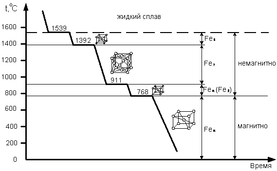 До температуры 1539ºС железо остается жидким. При температуре 1539ºС начинается кристаллизация и образуется δ-железо, имеющее кубическую объемно-центрированную решетку. Между температурами 1400 и 910ºС происходит перестройка этой решетки в новую модификацию – γ-железо с образованием кубической гранецентрированной решетки. Ниже температуры 910ºС железо переходит в новую форму – α-железо с кубической объемно-центрированной решеткой. При температуре 768ºС происходит последняя температурная остановка с образованием магнитной формы α-железа, в которой сохраняется объемно-центрированная решетка.