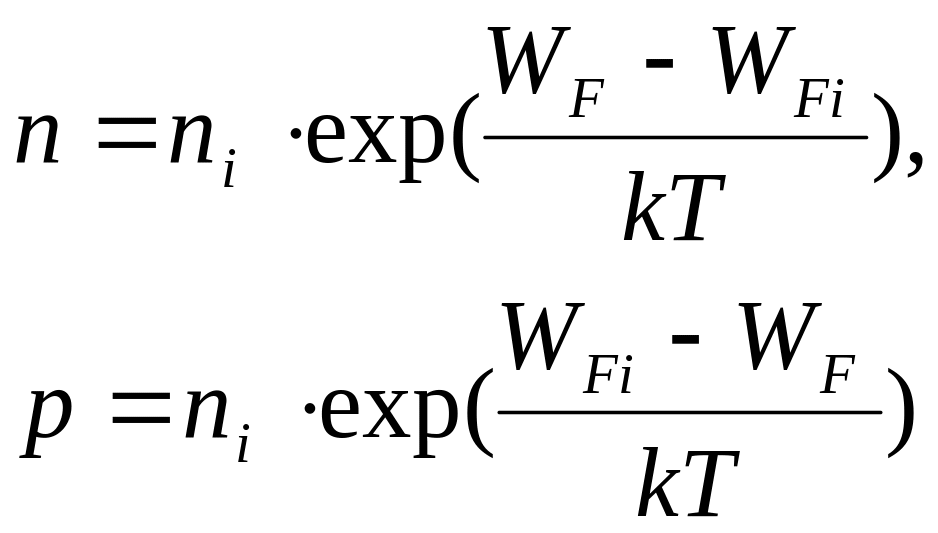 Концентрацию электронов и дырок в примесном полупроводнике (вне зависимости от типа примеси) можно выразить через уровень Ферми данного полупроводника, уровень Ферми собственного полупроводника и концентрацию носителей в собственном полупроводнике при данной температуре следующим образом: