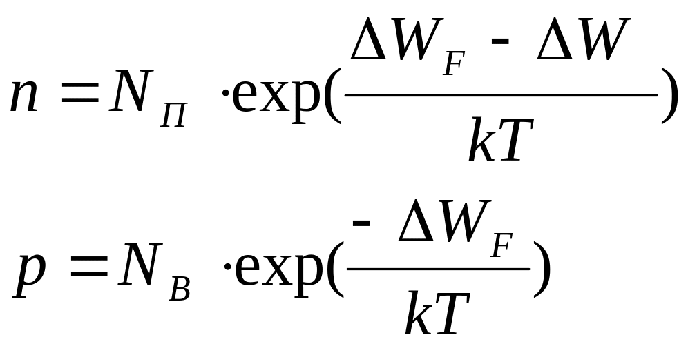 Учитывая, что разность ΔW = WП – WВ представляет собой ширину запрещенной зоны, а разность ΔWF = WF – WВ будет представлять собой расстояние уровня Ферми от потолка валентной зоны, можно преобразовать выражения (2.8) и (2.9) к следующему виду: