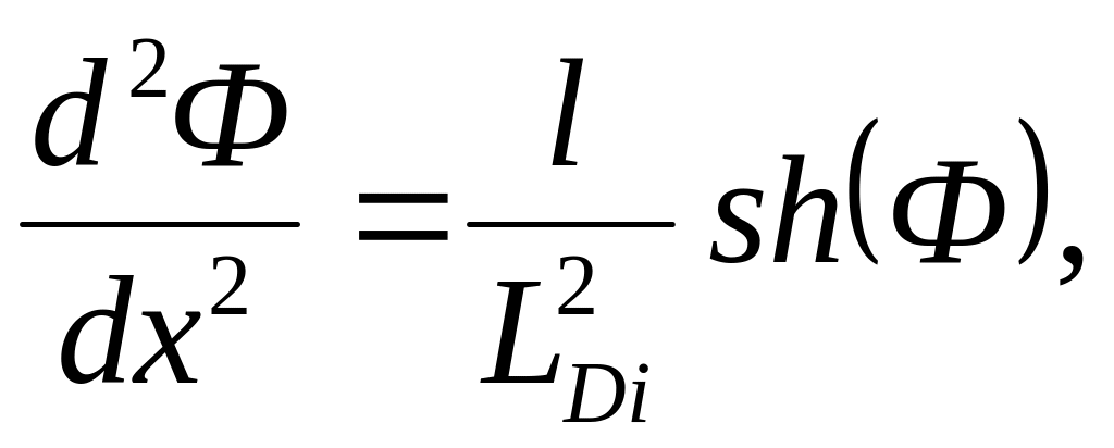 Для кремния LDi = 14 мкм. l – глубина проникновения зарядов. Рассмотрим простейший случай, когда |φs| < φТ, т.e. |Φ|<1. В этом случае можно положить sh Ф ≈ Ф и (2.42) превращается в линейное дифференциальное уравнение 1-го порядка. Для граничных условий φ(∞) = 0 и φ(0) = φs , решение имеет вид: