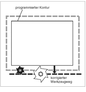 На основании коррекции радиуса учитываются различные значения радиуса инструмента. Эта необходимая коррекция касается не только фрезерного инструмента, но и токарного инструмента.