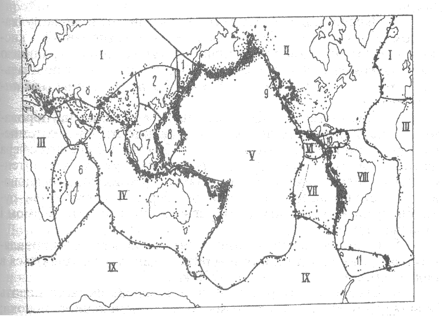 Головні плити: І – Євразійська, ІІ – Північноамериканська, ІІІ – Африканська, ІV – Індо-Австралійська, V – Тихоокеанська, VІ – Наска, VІІ – Кокосова, VІІІ – Південноамериканська, ІХ – Антарктична; малі плити: 1 – Охотська, 2 – Амурська, 3 – Тібетська, 4 – Іранська, 5 – Аравійська, 6 – Сомалійська, 7 – Китайська, 8 – Філіппінська, 9 – Хуан-де-Фука, 10 – Карибська, 11 - Скоша